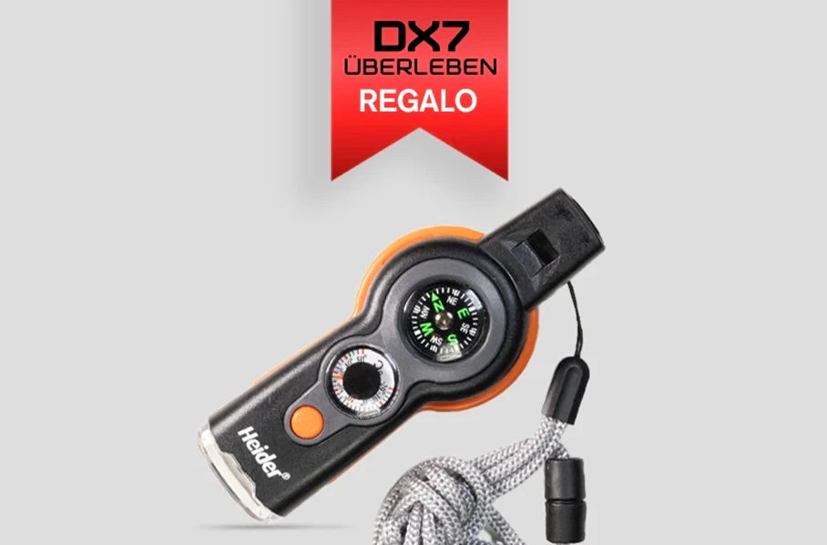 Diseñado tanto para emergencias como para actividades al aire libre, el multifuncional Heider DX7 Überleben viene equipado con 7 características únicas: Silbato de alta frecuencia, Linterna LED, Brújula, Termómetro, Espejo, Lupa y Cordón.