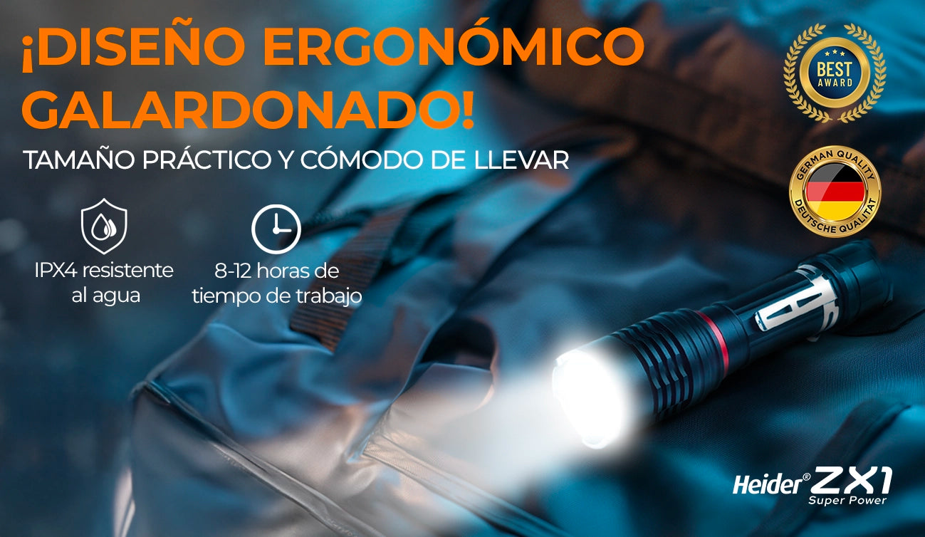 El HEIDER ZX1 es una linterna altamente duradera ya que es resistente al agua y a los impactos.